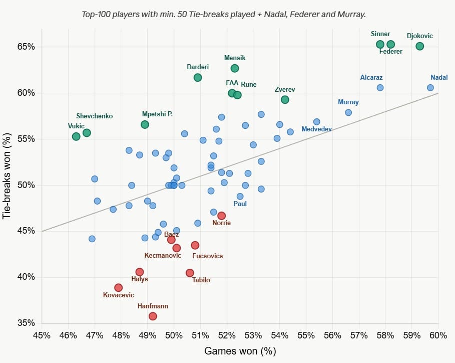 As for Nadal and Alcaraz, while they do win a higher % of tie-breaks than games (as expected), their performance is clearly below that of Sinner, Federer and Djokovic.